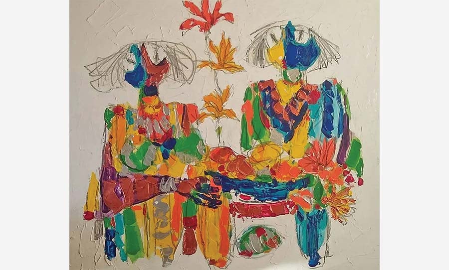 التأمل في بعض هذه الأعمال، أخذنا إلى عوالم الفنان، وهي عوالم لا تُحيل إلا على ذاتها، على تمثلاتها وتخيُلاتها، وليست صدًى لشيء سابق عليها، وهذا في تصورنا، هو أحد نقاط قوة هذا الفنان الذي له توقيعه الشخصي، وله فراشاته التي يعرف متى يُطلقُها في بساتينه البديعة، لتعبث بانجرافات الريح والغُبار. البهجة ونشوة الألوان، هي نشوة ما نسمعُه، أيضاً، من أصوات، وما نشُمه من روائح، وما نسرح فيه من صُور وأشكال، ولعل البياضات التي تبرز من تحت الألوان، هي نفسها انبثاقات الشمس من بين الغيوم الكثيفة التي تحجُبُها، فهي بقدر ما تحجبها تكشفها وتزيدها ظهوراً وانكشافاً.