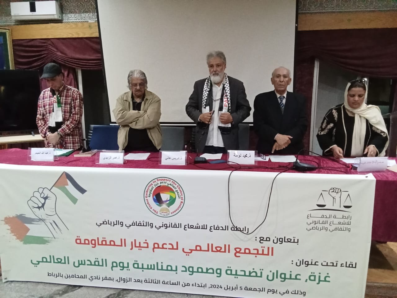 التأمت إرادة مجموعة من الفاعلين على تخليد ذكرى يوم القدس العالمي، إذ تم تنظيم ندوة فكرية تضامنية بالرباط تحت عنوان “غزة عنوان تضحية وصمود بمناسبة يوم القدس العالمي”، شارك فيه كل من الكاتب ومؤرخ الحركة الاتحادية والفدائي في السبعينات من القرن الماضي في صفوف الثورة الفلسطينية محمد لومة، والمناضل اليساري والمعتقل السياسي سابقا عمر الزيدي، والكاتب والمترجم عبد الله الحيمر، وأداره إدريس هاني، المنسق العام للتجمع العالمي لدعم خيار المقاومة، والذي تم تنظيمه من قبل التجمع بشراكة مع رابطة الدفاع للإشعاع القانوني والثقافي والرياضي، واحتضنت فعالياته قاعة نادي هيئة المحامين بالرباط، اليوم الجمعة.