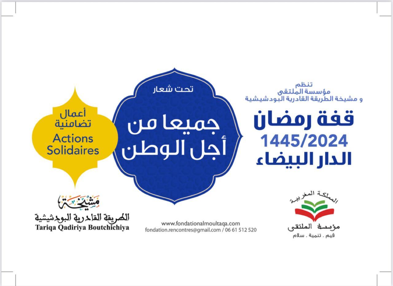 كعادتها في شهر رمضان المبارك من كل سنة ، نظمت مشيخة الطريقة القادرية البودشيشية و مؤسسة الملتقى عملية توزيع القفة الرمضانية، وذلك تحث شعار “جميعا من أجل الوطن” ، والتي استهدفت مجموعة من الفئات المعوزة ، وشملت كافة تراب المملكة المغربية.