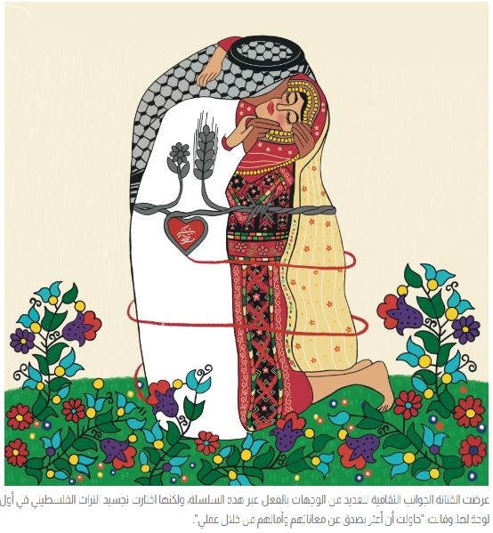 إنه عمل يحمل رسالة سياسية، وليس فقط رسالة إنسانية أو فلسطنة لوحة عالمية، لقد أبرزت اللوحة الكثير من عناصر التراث الفلسطيني المرتبط بالزي: فالرجل في اللوحة يرتدي الحطة الفلسطينية (الكوفية) والعقال، والمرأة تلبس الثوب الفلسطيني التقليدي الطويل، بالإضافة إلى سنبلة ووردة وقلب حب يخرج منه خط باللون الأحمر يلفّ الجسدين معاً.