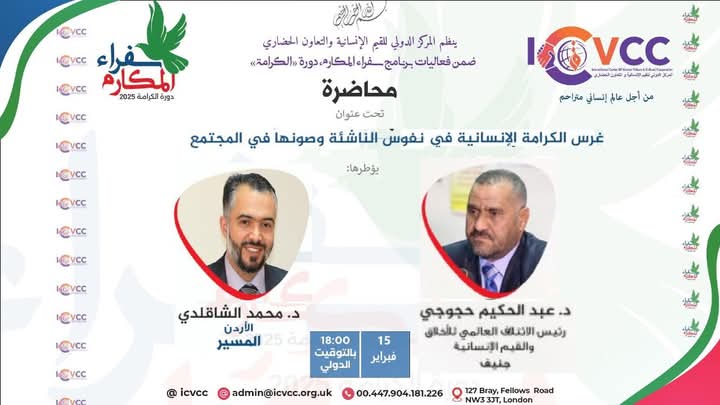 ضمن فعاليات “دورة كرامة” التي انطلقت خلال هذا الشهر الجاري- فبراير، نظم المركز الدولي للقيم الإنسانية والتعاون الحضاري يومه السبت 15/02/2025 المحاضرة الثانية خلال هذه الدورة إلى جانب الندوات والورشات، تحت عنوان “غرس الكرامة الإنسانية في نفوس الناشئة وصونها في المجتمع”.
