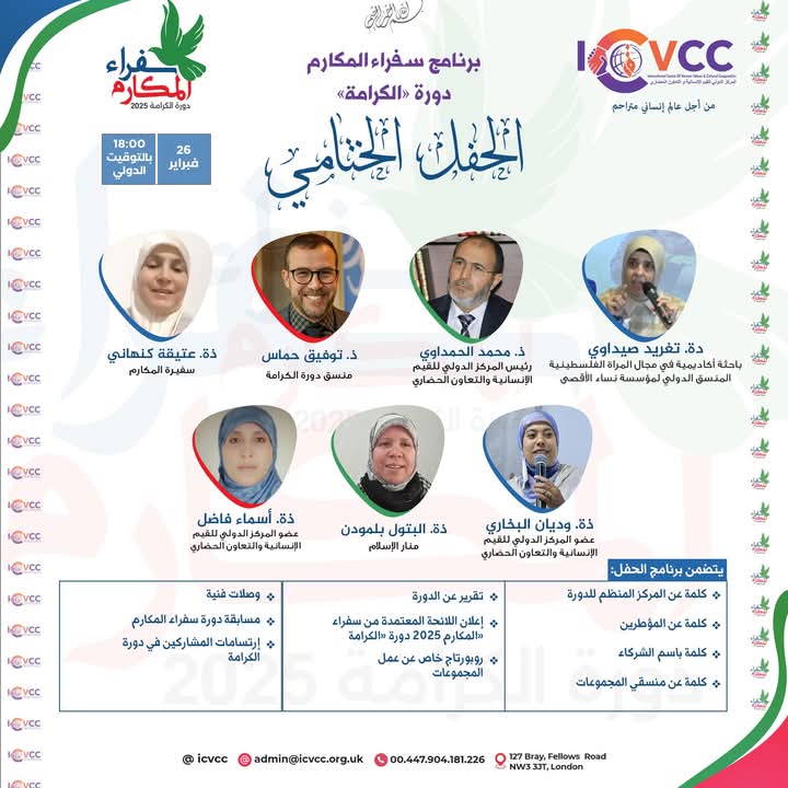 نظم المركز الدولي للقيم الإنسانية والتعاون الحضاري يومه الأربعاء 26 فبراير 2025، الحفل الختامي لفعاليات النسخة الثالثة من برنامج سفراء المكارم؛ “دورة الكرامة”، والتي نظمها المركز بشراكة مجموعة من المؤسسات البحثية والمراكز التدريبية والهيآت العلمية العالمية.