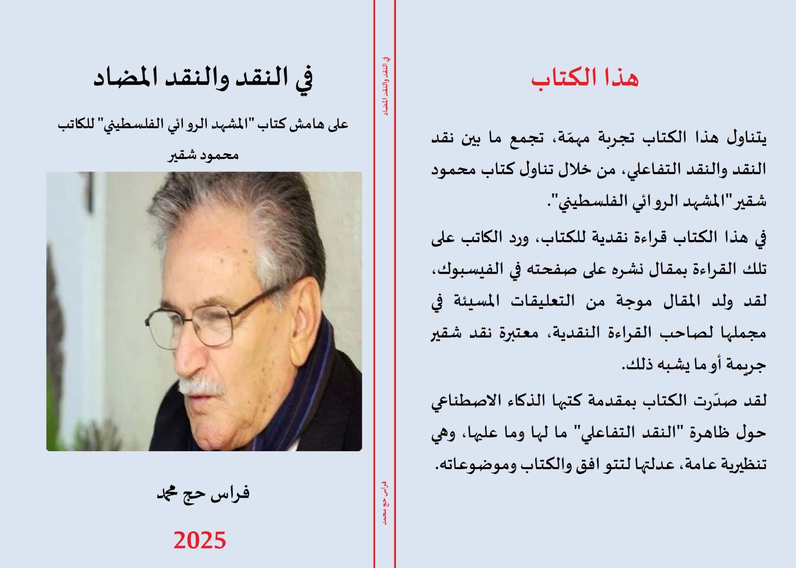 في خطوة تثير النقاش وتفتح آفاقًا جديدة في المشهد النقدي العربي، صدر مؤخرًا كتاب “في النقد والنقد المضاد: على هامش كتاب المشهد الروائي الفلسطيني للكاتب محمود شقير” للكاتب والناقد فراس حج محمد. يقدم هذا الإصدار الإلكتروني لعام 2025 دراسة معمقة لظاهرة “النقد التفاعلي” التي باتت سمة مميزة للعصر الرقمي، متخذًا من الجدل الذي أثاره مقال نقدي حول كتاب “المشهد الروائي الفلسطيني” نموذجًا حيًا لتجلياتها وتحدياتها، إذ بدأت المسألة بمقال للمؤلف حج محمد “الناقد ليس مهندس علاقات أدبية” تناول فيه كتاب شقير، فتبعه ردّ من مؤلف الكتاب، وهذا الردّ أثار موجة من التعليقات.