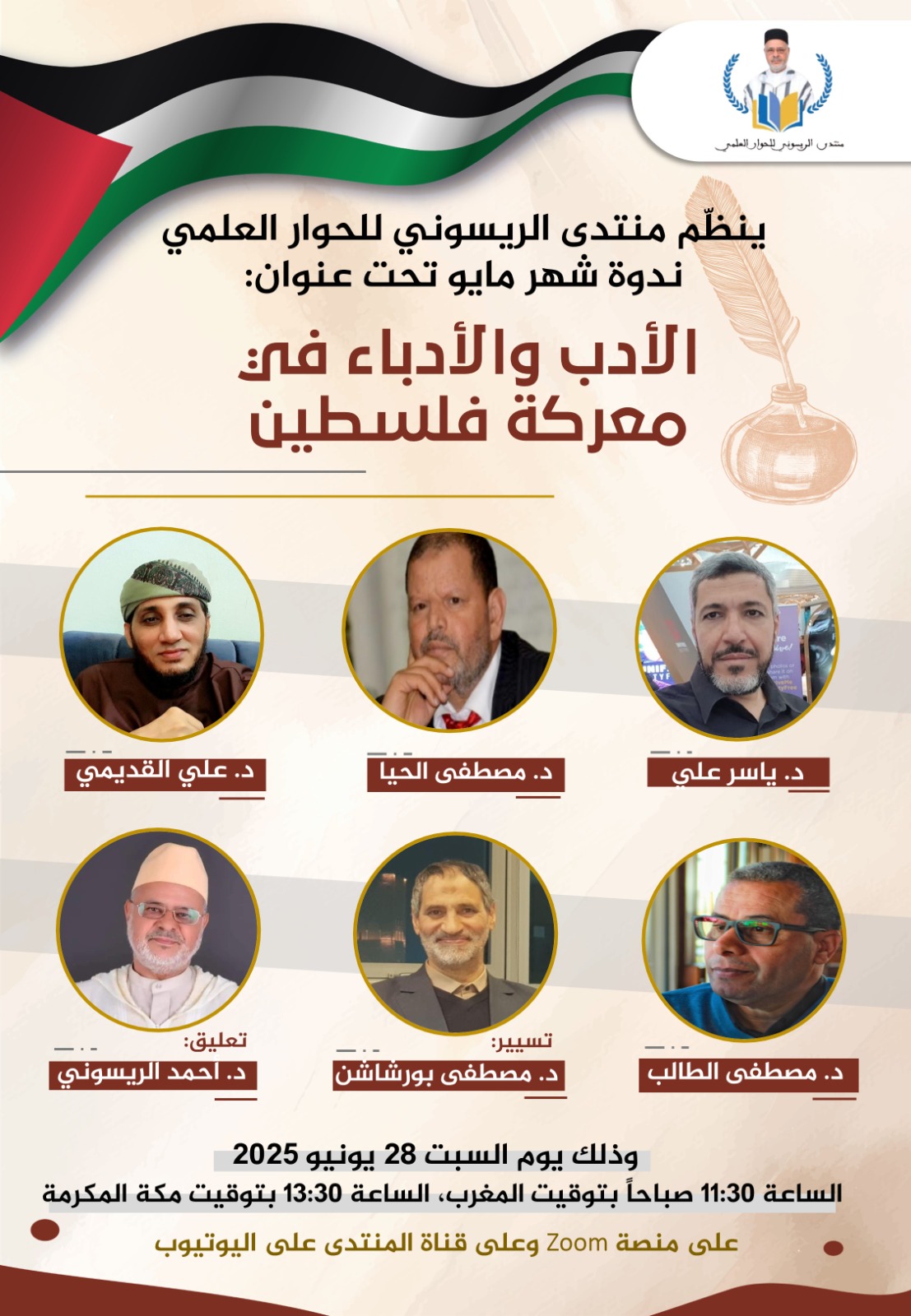 في إطار أنشطته العلمية الشهرية ينظم منتدى الريسوني للحوار العلمي ندوة شهر مايو في موضوع “الأدب والأدباء في معركة فلسطين”. و ذلك يوم السبت 28 يونيو 2025م/ 3 محرم 1447هج.