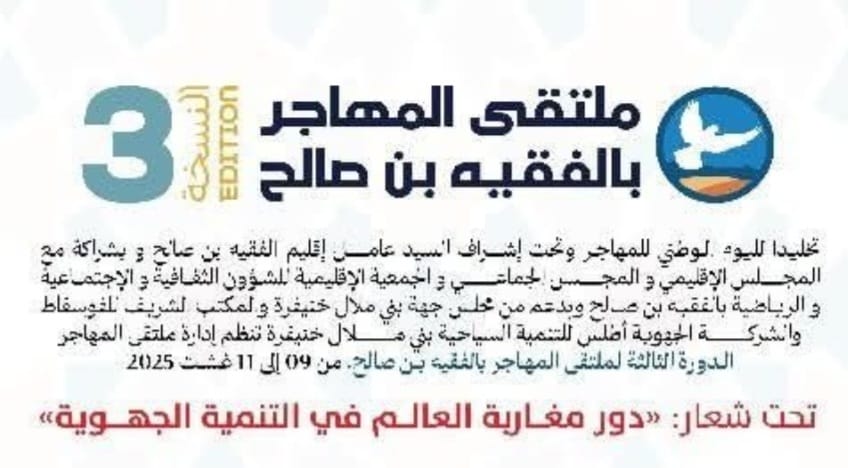 تتشرف مدينة الفقيه بن صالح بدعوة جميع أبناء الجالية المغربية بالخارج، والمهتمين بقضايا الهجرة والتنمية والهوية، للمشاركة في النسخة الثالثة من “ملتقى المهاجر”، والذي سينعقد من 09 إلى 11 غشت 2025، تحت شعار: