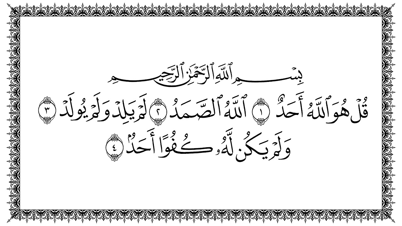 بسم الله الرحمن الرحيم قُلْ هُوَ اَ۬للَّهُ أَحَدٌۖ (1) اِ۬للَّهُ اُ۬لصَّمَدُۖ (2) لَمْ يَلِدْ وَلَمْ يُولَدْۖ (3) وَلَمْ يَكُن لَّهُۥ كُفُؤاً اَحَدٞۖ (4)
