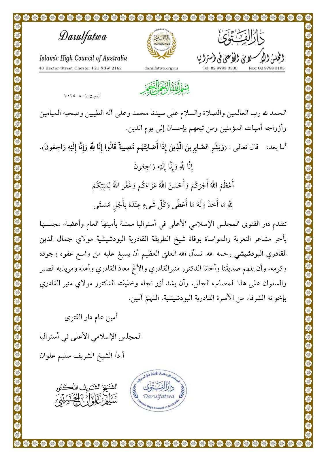 دار الفتوى المجلس الاسلامي الأعلى في أستراليا: رسالة تعزية بوفاة شيخ الزاوية القادرية البودشيشية الدكتور سيدي جمال الدين القادري بودشيش