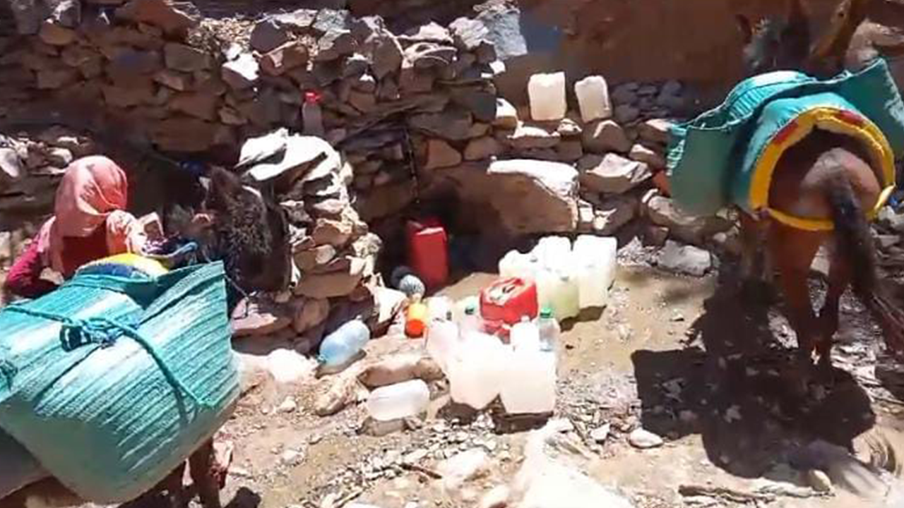 اليوم، يقطع السكان – أطفالًا وشيوخًا ونساءً – رحلات مهينة تدوم لساعتين على ظهور الدواب فقط لجلب كمية من الماء بالكاد تكفي ليوم واحد.