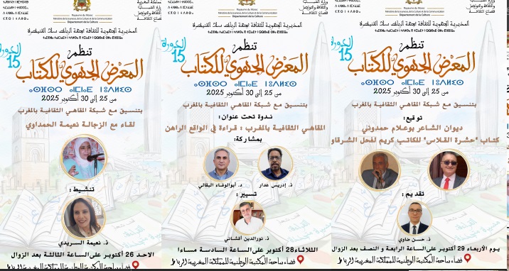 بعد نسخة مدينة تمارة للسنة الماضية، برمجت شبكة المقاهي الثقافية بالمغرب بتنسيق مع المديرية الجهوية للثقافة بجهة الرباط سلا القنيطرة ثلاث لقاءات بالمعرض الجهوي للكتاب في نسخته ال15 المنظم تحت شعار “القراءة مسيرة متجددة ” وذلك بساحة المكتبة الوطنية للمملكة المغربية بالرباط حسب البرنامج التالي :