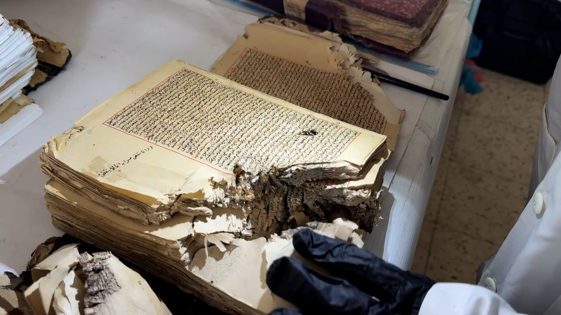 ورغم حجم الخراب، تمكنت حنين العمصي، مع فريق تطوعي صغير، من انتشال وإسعاف نحو 147 مخطوطة من تحت ركام دائرة المخطوطات في المسجد العمري الكبير، في محاولة أخيرة لإنقاذ ما تبقى من الذاكرة المكتوبة قبل أن تُمحى بالكامل.