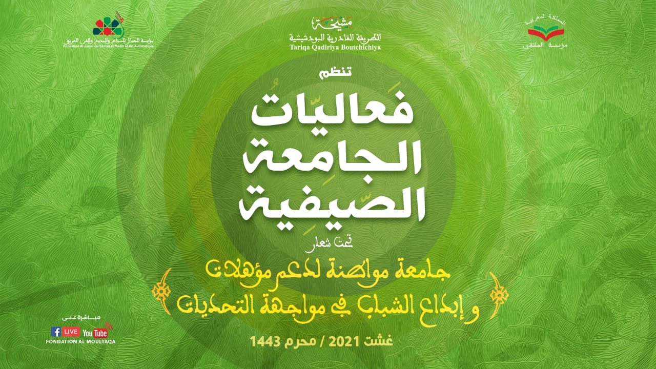 وهذا العام وعلى غرار السنة الماضية، واعتبارا للأزمة الصحية المرتبطة بجائحة كورونا -كوفيد 19-، قررت مشيخة الطريقة القادرية البودشيشية تنظيم الجامعة الصيفية افتراضيا عبر المنصات الرقمية لمؤسسة الملتقى، تحت شعار “جامعة مواطنة لدعم مؤهلات وإبداع الشباب في مواجهة التحديات”.
